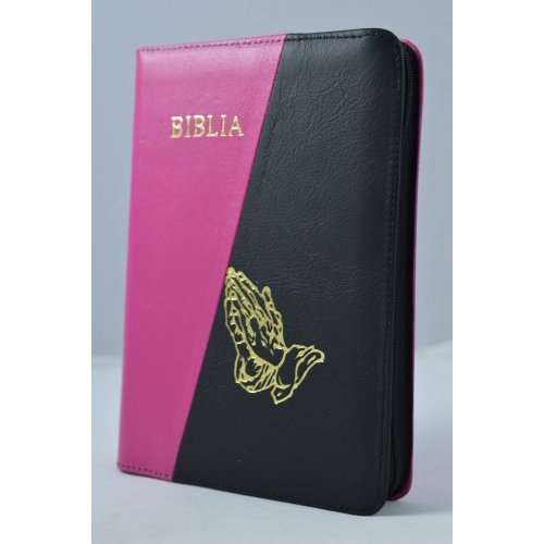 Biblia din piele, medie,roz violet / negru, fermoar, aurita, cu maini gravate, cuv. lui Isus cu rosu [052]