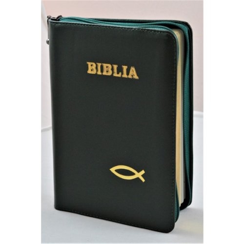 Biblia din piele, medie, verde inchis, fermoar, aurita, simbolul peste, cuv. lui Isus cu rosu [052]