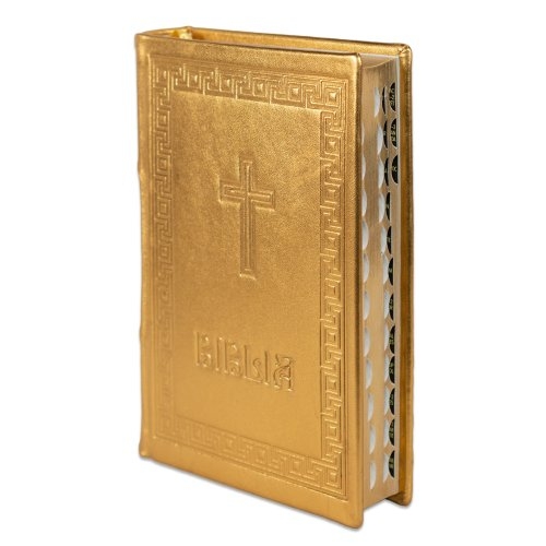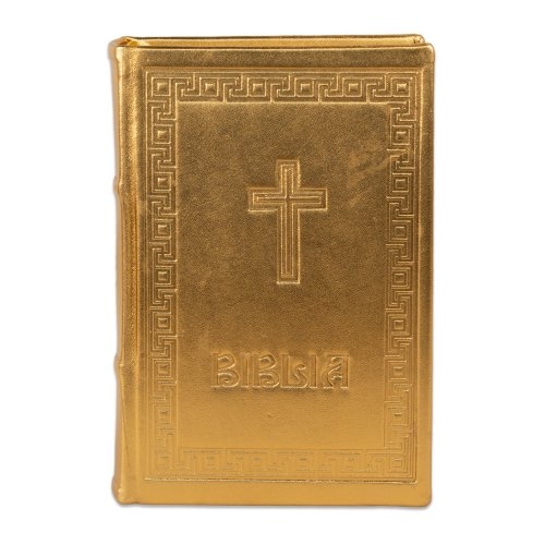 Biblia editie limitata, prelucrata manual, marime medie, auriu sidefat , margini aurii, index, simbol cruce, cuv. lui Isus cu rosu [057 HMI]