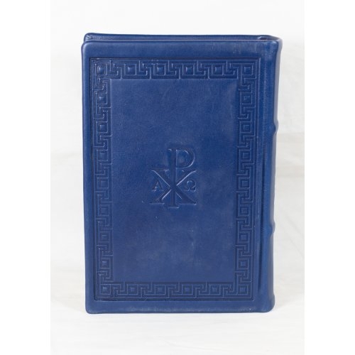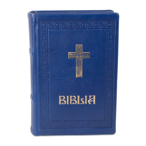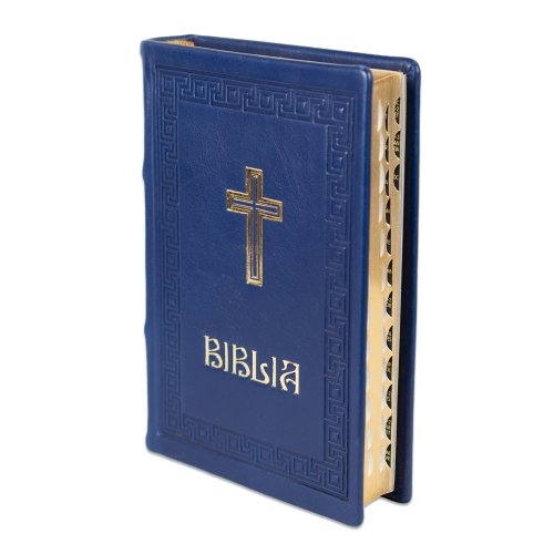 Biblia editie limitata, prelucrata manual, marime medie, bleumarin inchis , margini aurii, index, simbol cruce, cuv. lui Isus cu rosu [057 HMI]