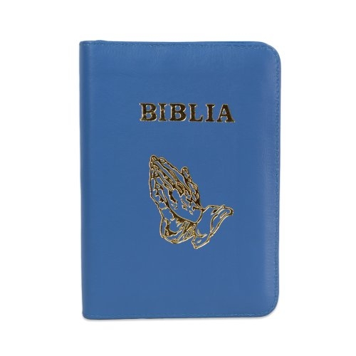 Biblia format mic, din piele, albastru, index, fermoar, margini argintii, simbol maini, cuv. lui Isus in rosu [047 PFI]