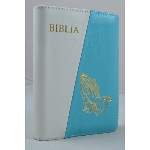 Biblia format mic, din piele, culoare alb/albastru turcoaz, fermoar, margini argintii, cu maini in ruga, cuv. lui Isus in rosu [047 PFI]