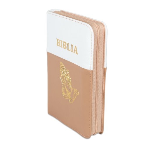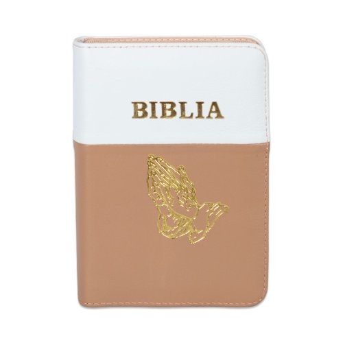 Biblia format mic, din piele, culoare alb cu roz pal, index, fermoar, margini argintii, simbolul maini in ruga, cuv. lui Isus in rosu [047 PFI]