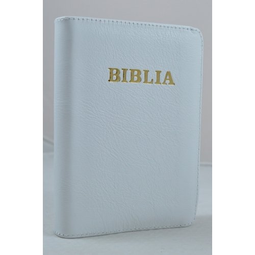 Biblia format mic, din piele, culoare alb, index, fermoar, margini aurii, cuv. lui Isus in rosu [047 PFI]