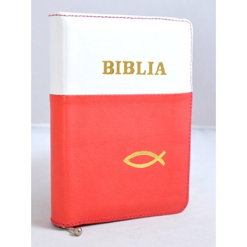 Biblia format mic, din piele, culoare alb - portocaliu, index, fermoar, margini argintii, simbol peste, cuv. lui Isus in rosu [047 PFI]