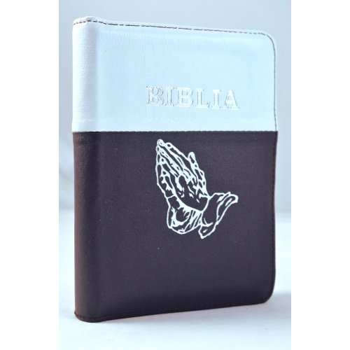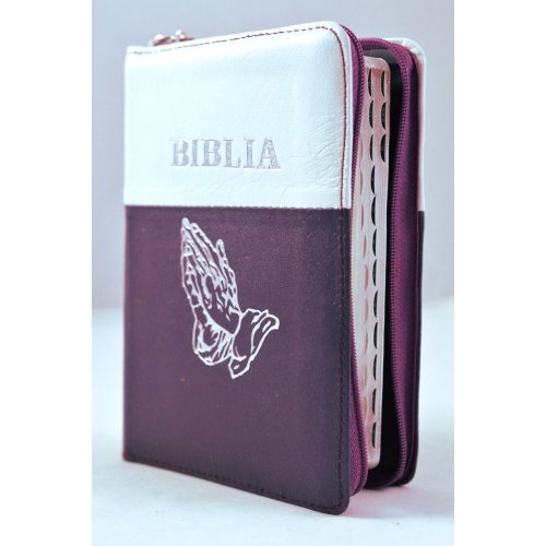 Biblia format mic, din piele, culoare alb - violet, index, fermoar, margini argintii, simbol maini in ruga, cuv. lui Isus in rosu [047 PFI]