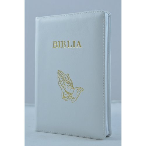 Biblia format mic, din piele, culoare alba, index, fermoar, margini aurii, cu maini in ruga, cuv. lui Isus in rosu [047 PFI]