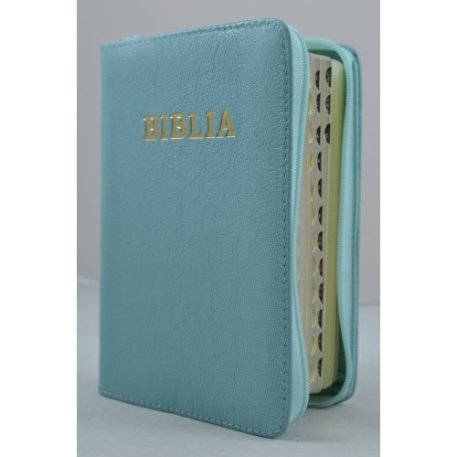 Biblia format mic, din piele, culoare albastru ciel, index, fermoar, margini argintii, cuv. lui Isus in rosu [047 PFI]