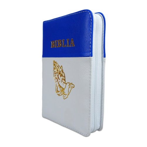 Biblia format mic, din piele, culoare albastru cu alb, index, fermoar, margini argintii, simbol maini in rugaciune, cuv. lui Isus in rosu [047 PFI]