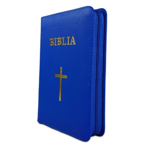 Biblia format mic, din piele, culoare albastru, index, fermoar, margini argintii, cu cruce, cuv. lui Isus in rosu [047 PFI]