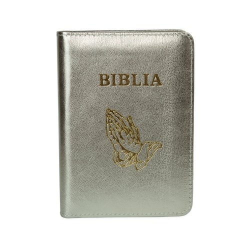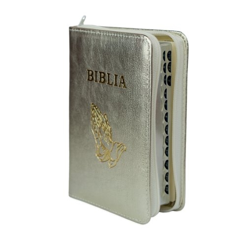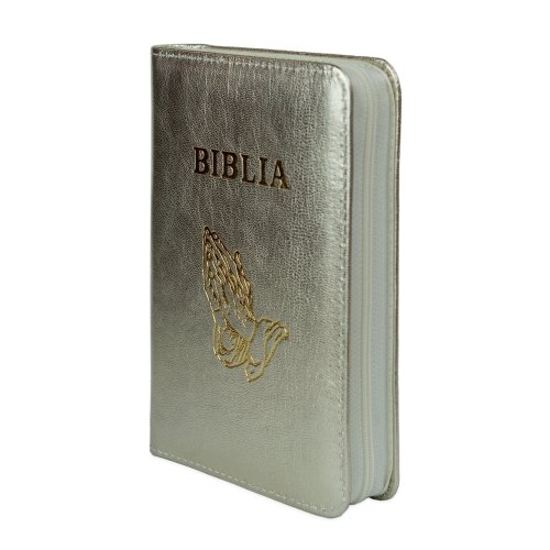 Biblia format mic, din piele, culoare, argintiu sidefat, index, simbol maini, fermoar, margini argintii, cuv. lui Isus in rosu [047 PFI]