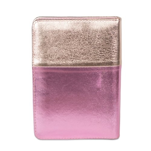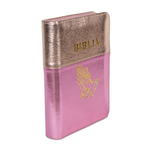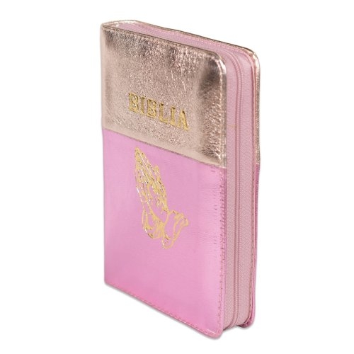 Biblia format mic, din piele, culoare auriu sidefat cu roz sidefat, index, fermoar, margini argintii, simbolul maini in ruga, cuv. lui Isus in rosu [047 PFI]