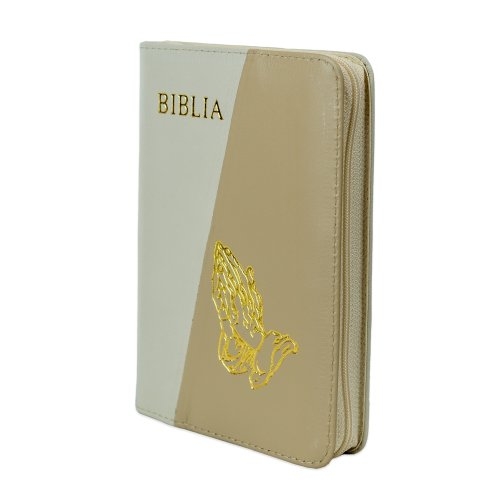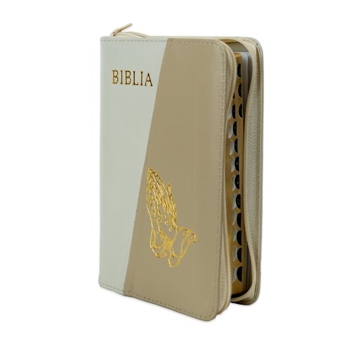 Biblia format mic, din piele, culoare, bej deschis cu bej închis, index, simbol maini, fermoar, margini argintii, cuv. lui Isus in rosu [047 PFI]
