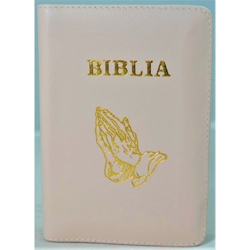 Biblia format mic, din piele, culoare bej, index, fermoar, margini argintii, simbolul maini in ruga, cuv. lui Isus in rosu [047 PFI]