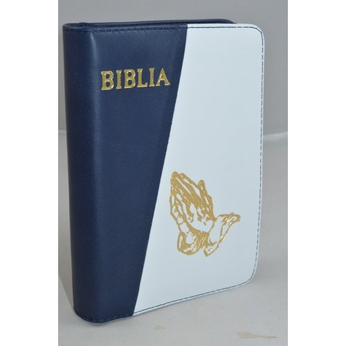 Biblia format mic, din piele, culoare bleumarin/alb, index, fermoar, margini argintii, simbolul maini in ruga, cuv. lui Isus in rosu [047 PFI]