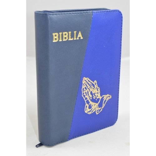 Biblia format mic, din piele, culoare bleumarin inchis/bleumarin, index, fermoar, margini argintii, simbolul maini in ruga, cuv. lui Isus in rosu [047 PFI]