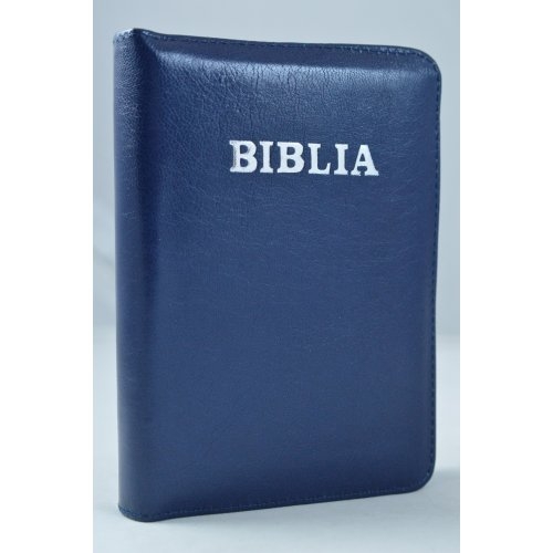 Biblia format mic, din piele, culoare bleumarin, index, fermoar, margini aurii, simbol peste, cuv. lui Isus in rosu [047 PFI]