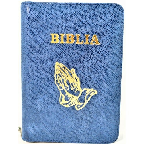 Biblia format mic, din piele, culoare bleumarin texturat, index, fermoar, margini argintii, simbolul maini in ruga, cuv. lui Isus in rosu [047 PFI]
