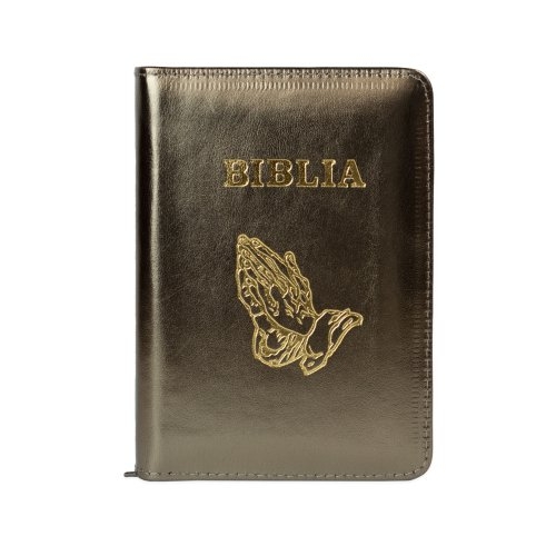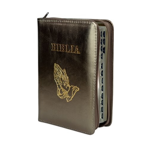 Biblia format mic, din piele, culoare, bronz sidefat, index, simbol maini, fermoar, margini argintii, cuv. lui Isus in rosu [047 PFI]