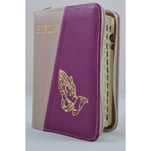 Biblia format mic, din piele, culoare cappuccino / mov index, fermoar, margini argintii, cu maini in ruga, cuv. lui Isus in rosu [047 PFI]