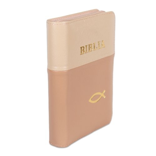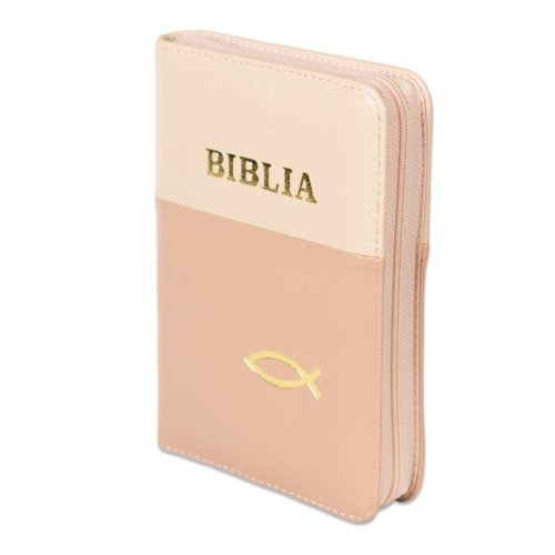 Biblia format mic, din piele, culoare crem cu cappucino,dex, fermoar, margini argintii, simbol cu peste, cuv. lui Isus in rosu [047 PFI]