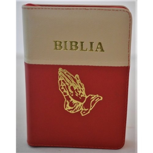 Biblia format mic, din piele, culoare crem-rosu, index, fermoar, margini argintii, simbolul maini, cuv. lui Isus in rosu [047 PFI]