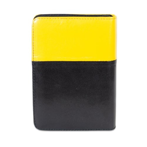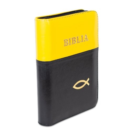 Biblia format mic, din piele, culoare galben cu negru, dex, fermoar, margini argintii, simbol peste, cuv. lui Isus in rosu [047 PFI]