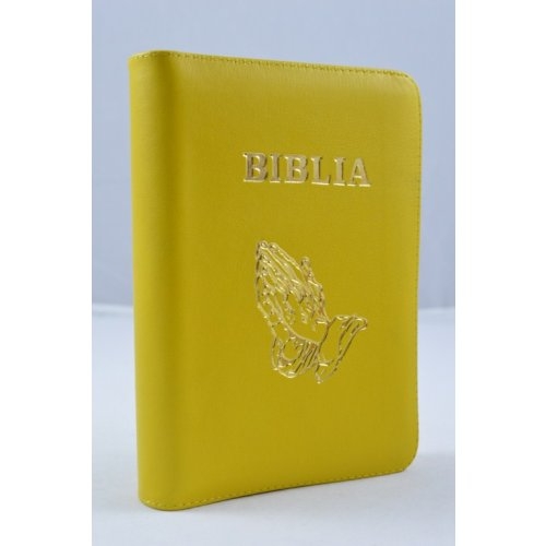 Biblia format mic, din piele, culoare galbena, index, fermoar, margini aurii, cu maini in ruga, cuv. lui Isus in rosu [047 PFI]