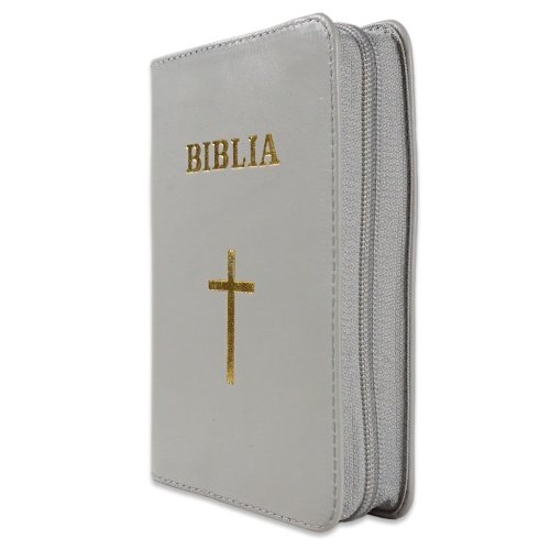 Biblia format mic, din piele, culoare gri, index, fermoar, margini argintii, cu cruce, cuv. lui Isus in rosu [047 PFI]