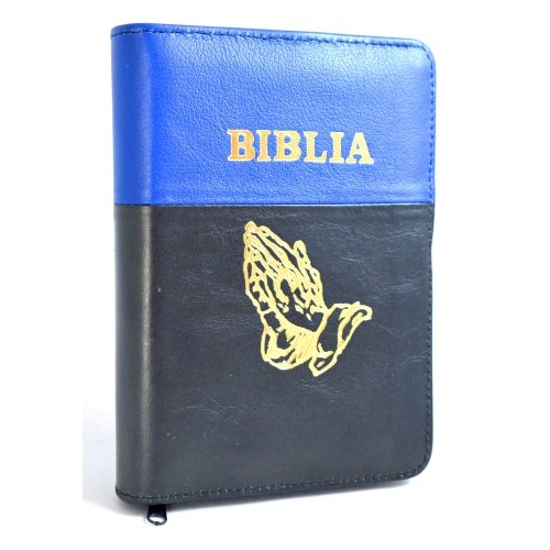 Biblia format mic, din piele, culoare indigo-negru, index, fermoar, margini argintii,simbol maini, cuv. lui Isus in rosu [047 PFI]