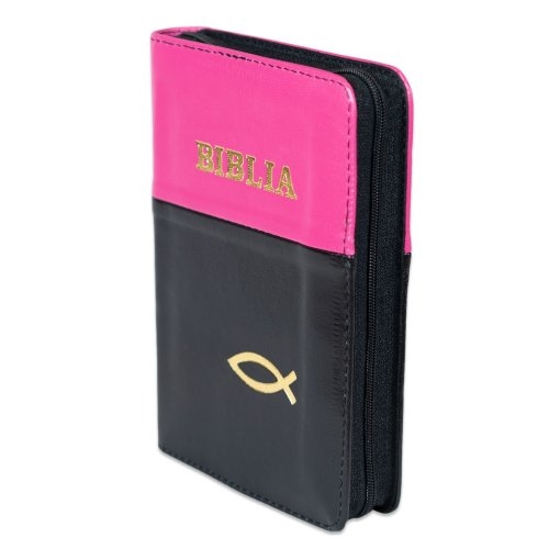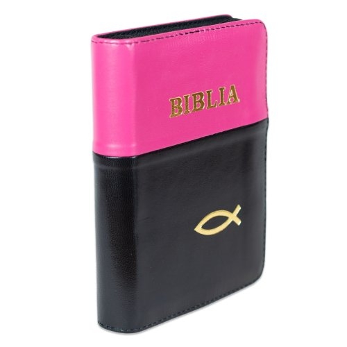 Biblia format mic, din piele, culoare magenta fucsia cu negru,index, fermoar, margini argintii, simbol cu peste, cuv. lui Isus in rosu [047 PFI]