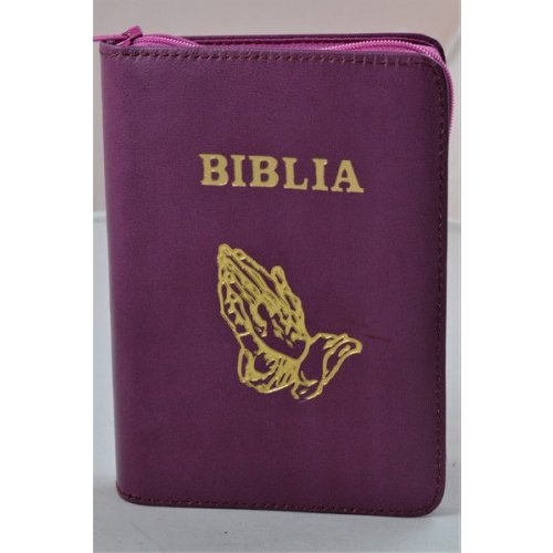 Biblia format mic, din piele, culoare magenta, index, fermoar, margini argintii,simbolul maini in ruga, cuv. lui Isus in rosu [047 PFI]
