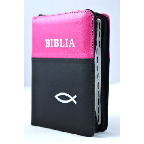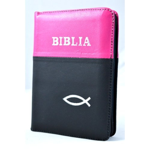 Biblia format mic, din piele, culoare magenta - negru, index, fermoar, margini argintii, simbol peste, cuv. lui Isus in rosu [047 PFI]