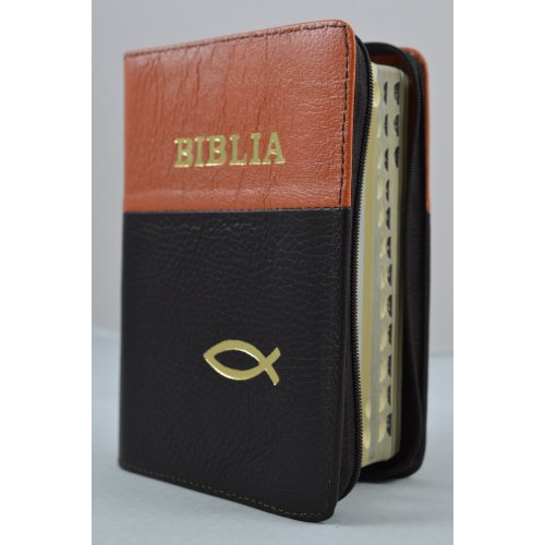 Biblia format mic, din piele, culoare maro cu portocaliu, index, fermoar, margini argintii, cu peste, cuv. lui Isus in rosu [047 PFI]
