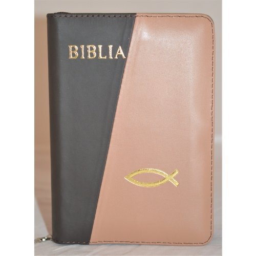 Biblia format mic, din piele, culoare maro inchis / maro deschis, index, fermoar, margini argintii,simbolul peste, cuv. lui Isus in rosu [047 PFI]