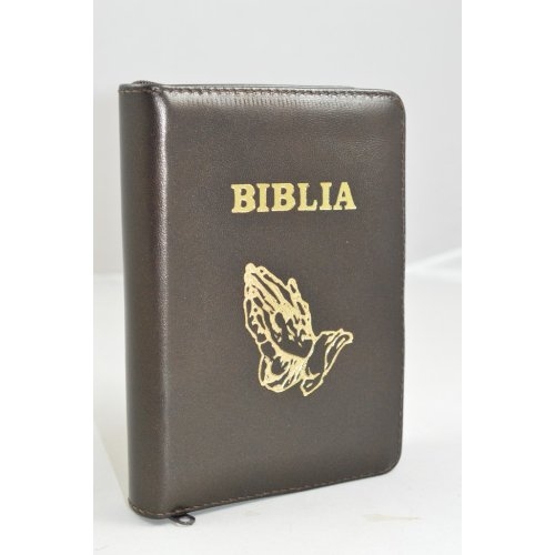 Biblia format mic, din piele, culoare maro, index, fermoar, margini argintii, simbolul maini in ruga, cuv. lui Isus in rosu [047 PFI]