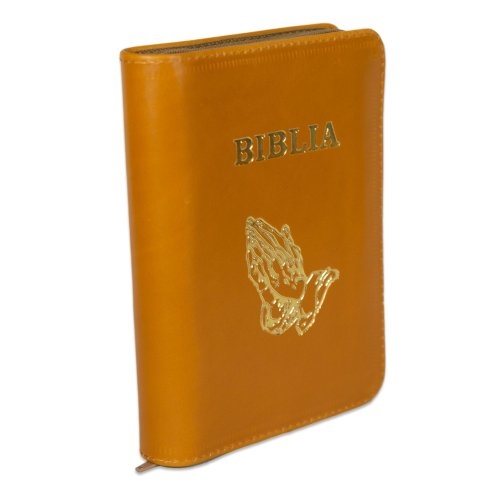 Biblia format mic, din piele, culoare maro sienna, dex, fermoar, margini argintii, simbolul maini in ruga, cuv. lui Isus in rosu [047 PFI]