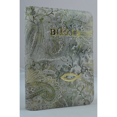 Biblia format mic, din piele, culoare motiv floral, index, fermoar, margini aurii, simbol - peste, cuv. lui Isus in rosu [047 PFI]