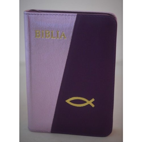 Biblia format mic, din piele, culoare mov sidef-mov inchis, index, fermoar, margini argintii, simbolul peste, cuv. lui Isus in rosu [047 PFI]