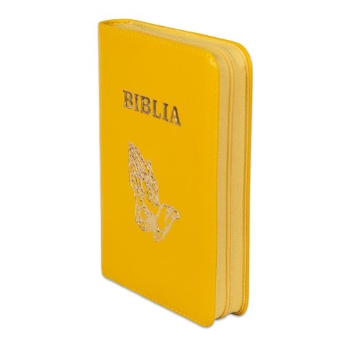 Biblia format mic, din piele, culoare mustar, index, fermoar, margini argintii, simbolul maini in ruga, cuv. lui Isus in rosu [047 PFI]