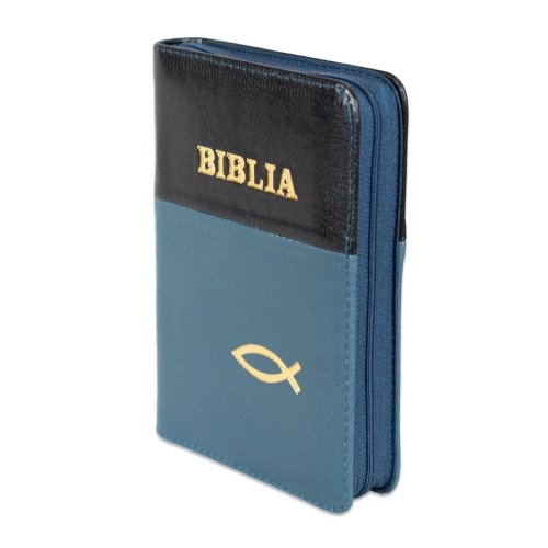 Biblia format mic, din piele, culoare negru cu albastru, dex, fermoar, margini argintii, simbol cu peste, cuv. lui Isus in rosu [047 PFI]