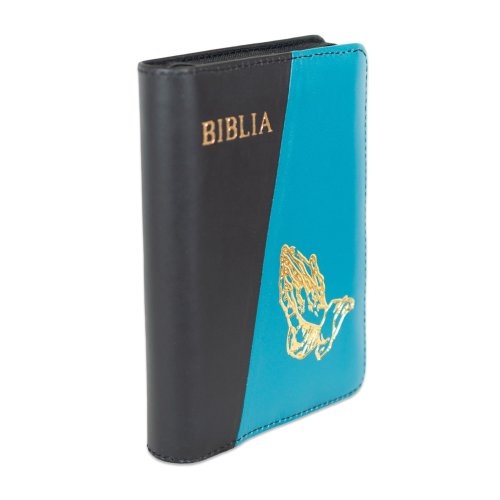 Biblia format mic, din piele, culoare negru cu albastru marin, dex, fermoar, margini argintii, simbolul maini in ruga, cuv. lui Isus in rosu [047 PFI]