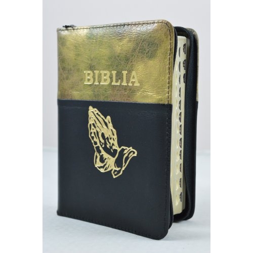 Biblia format mic, din piele, culoare negru cu army , index, fermoar, margini argintii, cu maini in ruga cuv. lui Isus in rosu [047 PFI]