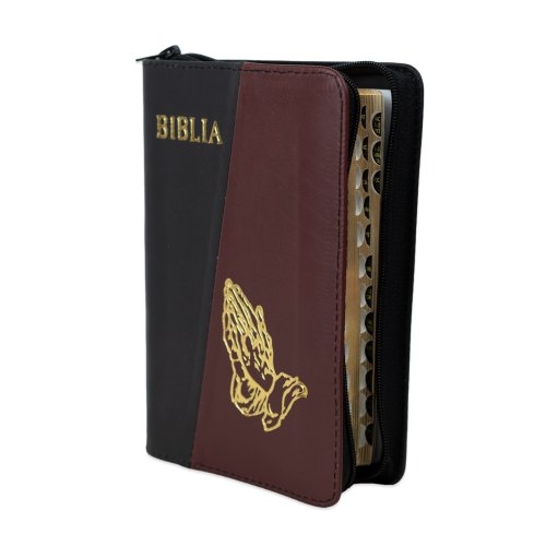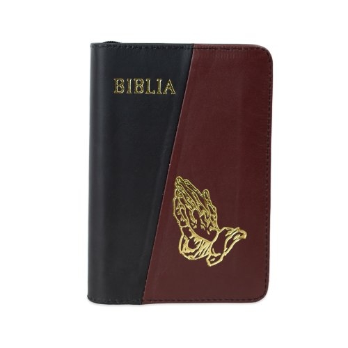 Biblia format mic, din piele, culoare, negru cu bordo, index, simbol maini, fermoar, margini argintii, cuv. lui Isus in rosu [047 PFI]