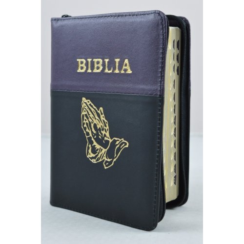 Biblia format mic, din piele, culoare negru cu mov inchis, fermoar, margini argintii, cu maini in ruga, cuv. lui Isus in rosu [047 PFI]