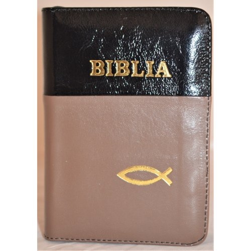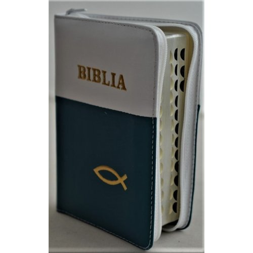 Biblia format mic, din piele, culoare negru cu nuanta gri inchis, index, fermoar, margini argintii, simbolul peste, cuv. lui Isus in rosu [047 PFI]