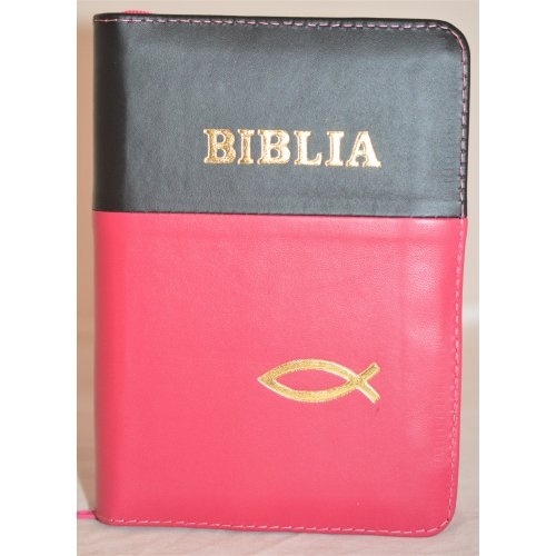 Biblia format mic, din piele, culoare negru cu roz inchis, index, fermoar, margini argintii, simbolul peste, cuv. lui Isus in rosu [047 PFI]