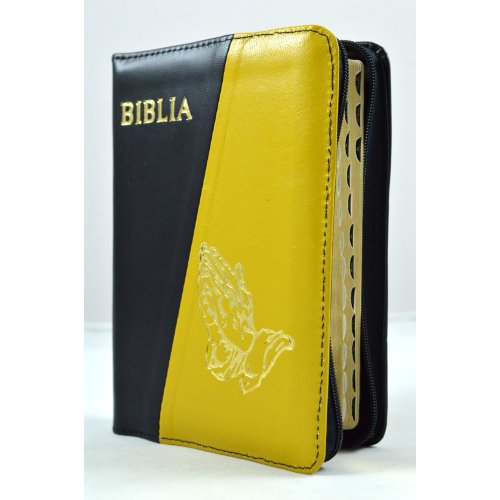 Biblia format mic, din piele, culoare negru / galben, index, fermoar, margini aurii, simbol - maini, cuv. lui Isus in rosu [047 PFI]