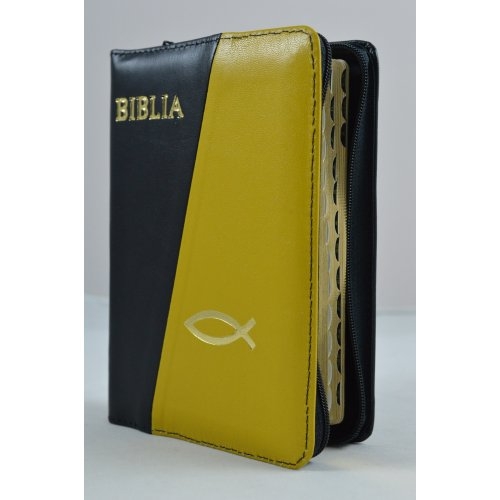 Biblia format mic, din piele, culoare negru-galben , index, fermoar, margini aurii, simbol - peste, cuv. lui Isus in rosu [047 PFI]