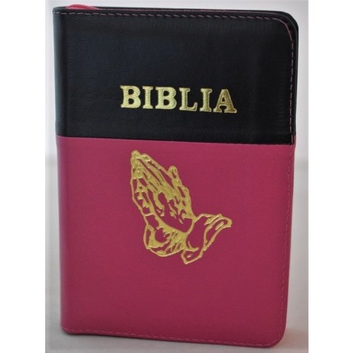 Biblia format mic, din piele, culoare negru-magenta, index, fermoar, margini argintii, simbolul maini, cuv. lui Isus in rosu [047 PFI]